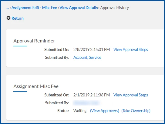 Sometimes you may need to troubleshoot why a fee isn’t approved and understand which phase is causing a delay. When you want to view the results of a specific workflow step, drilldown from the ViewApprovalDetails page to open an ApprovalHistoryResults page. From there, you can view details about the status of a step, the user that generated an action, and the date and timestamp the action occurred.