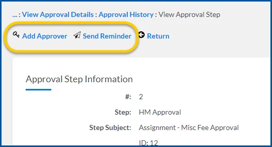 Optional. From the ApprovalHistory Results page, select the ViewApprovers link to open a ViewApprovalStep page. From the ViewApprovalStep page, you can see details about a specific approval step and which approvers are assigned to the step. From the ViewApprovalStep page, you can also take these actions: