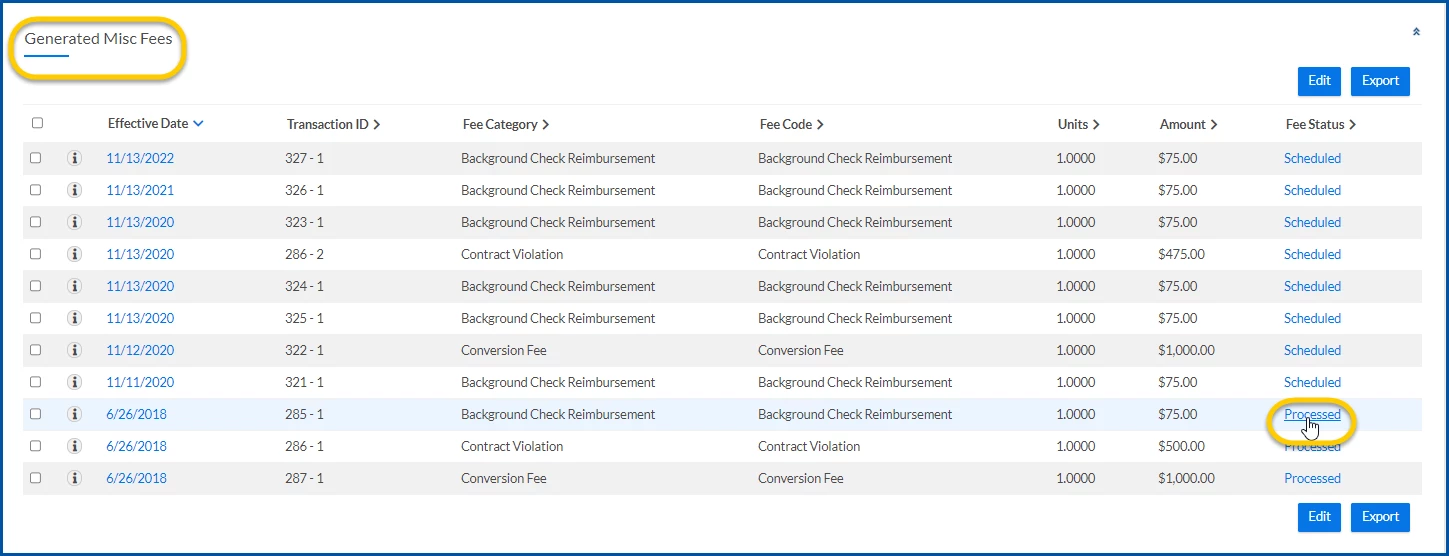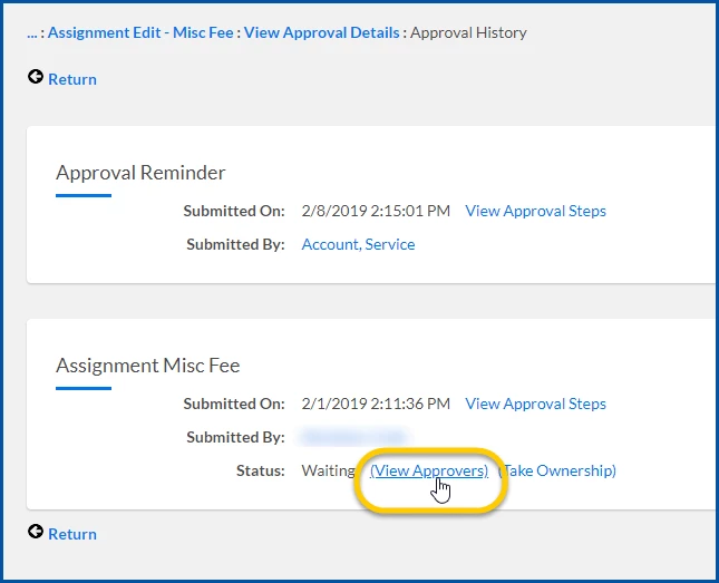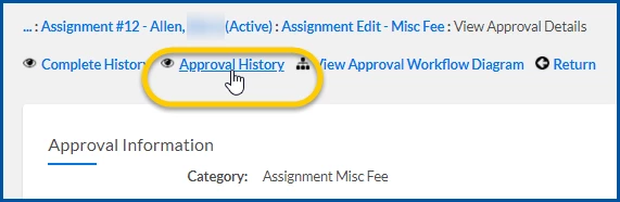 If you’ve chosen a fee in a Pending status, select ApprovalHistory.