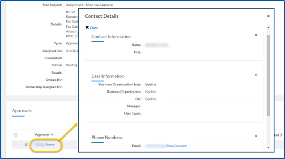 Drilldown and view contact information for a specific approver by selecting the Username link in the Approvers section.