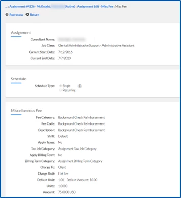 From the Simple Search option at the upper right of your dashboard, enter an assignment ID or a resource name for the active assignment to which you want to add a miscellaneous fee. An Assignment page displays.