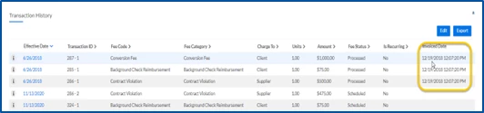 You can find the date and time a process fee was invoiced in the InvoicedDate column in the Transaction section on a MiscFee page. Be sure the fee you’re checking has a Processed status.