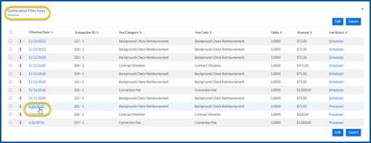 In the GeneratedMiscFees section, select the EffectiveDate link. A Misc Fee page displays.