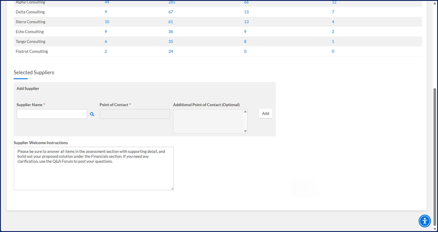 Part of creating a competitive bid includes inviting suppliers to the process. When you invite a supplier to participate in a bid, you also identify a POC for each supplier you invite. Plus, you can specify an additional supplier POCs.