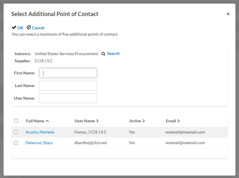 - Select the Additional Point of Contact Search icon. The Select Additional Point of Contact dialog displays.