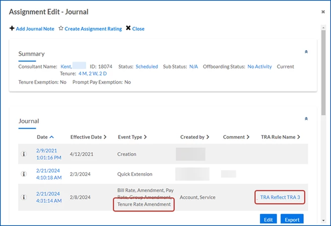 - When rates on an assignment were automatically adjusted rates on an assignment based on your tenure rate amendment rules, the rule name displays in the TRA Rule Name column.