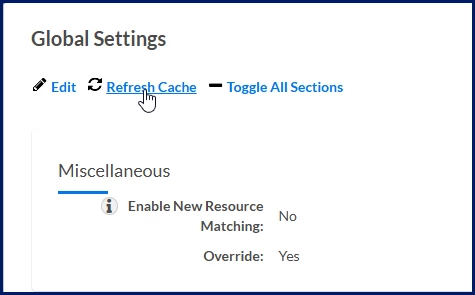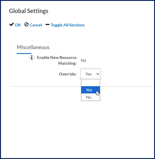 - In the Miscellaneous section under the Global Settings section, set the Enable New Resource Matching Override list to Yes.