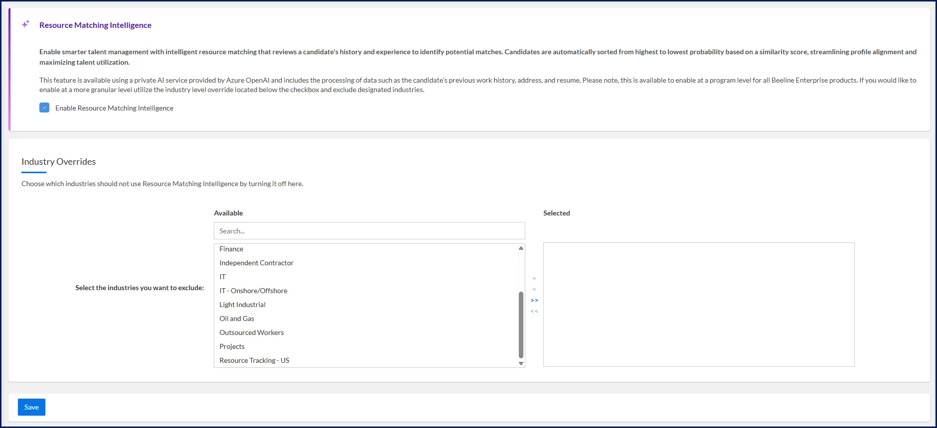 Your organization must have subscribed to the Premium AI package before you can add the Resource Matching Intelligence feature to Beeline Enterprise. AI packages can be added to Enterprise via a Make a Change ticket. Contact your Relationship Manager for details.