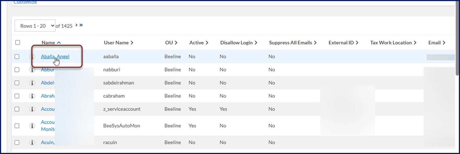 From the Search Results, select the Name link for the user whose profile you want to manage.