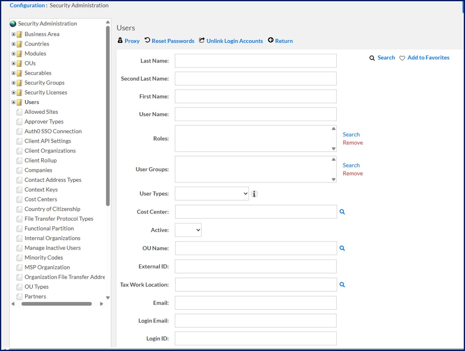 Use the fields on the Users page to enter identifying information about the user, and then select Search.