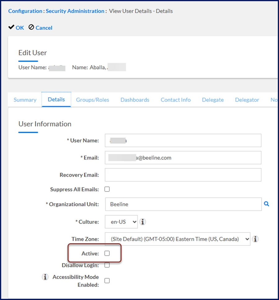 If the Active checkbox is selected, the user’s profile is enabled. If the Active checkbox isn’t selected, the user’s profile is inactive.
