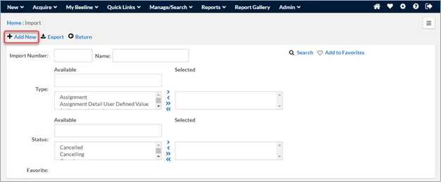 - On the Import list screen, click Add New. (Note: The Add New link is only visible to users granted Web Import Tool access rights.) The Import – Status: Creating screen displays.