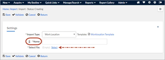 - Enter the name of your import file in the Name field. This is now your data-loaded import file you previously downloaded as a template. Follow any file-naming conventions required by your program.