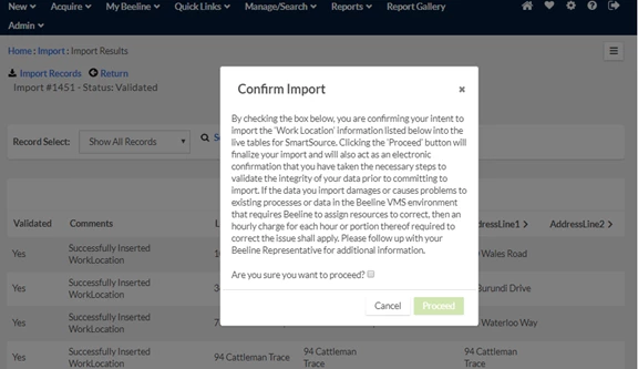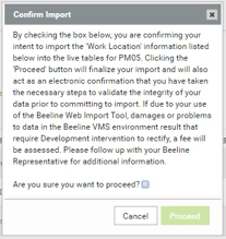 - A second confirmation pop-up window appears. This window includes a checkbox to indicate that you wish to proceed and that you accept responsibility for the data you are about to import. Click the checkbox and then click Proceed to continue. Note: each import process requires acceptance on BOTH confirmation windows.