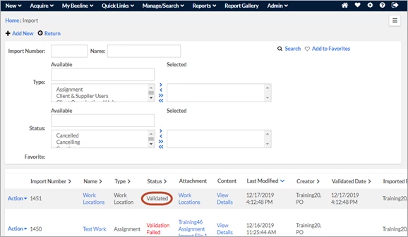 Once all line items in an import file have successfully validated, it is ready for import into a Beeline Enterprise environment. We strongly recommend that all validated import files be imported into a client-specific test environment (UAT) for review prior to their import into your production environment. Please reach out to your Beeline COM (Client Operations Manager) for assistance with project test environments. Process steps for importing validated files vary based on the assigned Web Import Tool usage rights granted to client-side users.