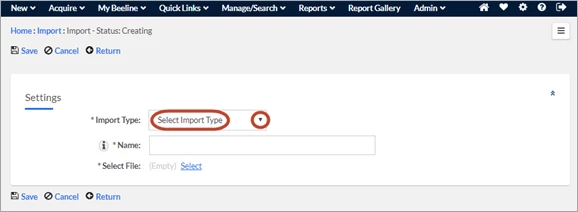 - Expand the Import Type drop-down list to select the import “type” that matches your import file.