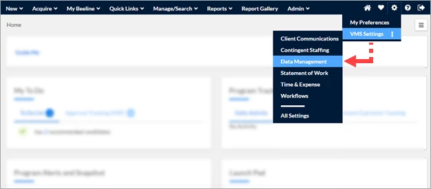 - Hover over VMS Settings, then click Data Management in the fly-out panel. The Data Management screen displays.