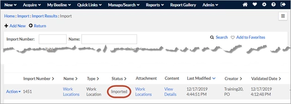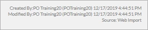 - Once completed, import results can be verified by locating any of the imported records using any of the Header Menu bar options (for example, Manage Search or Admin/Security). Locate a record you imported and then scroll down to the lower right corner of the record and you will see information that indicates the user, the date, and the time the record was “Created By” and “Modified By”. It will also indicate that the “Source” was a “Web Import”.