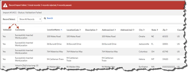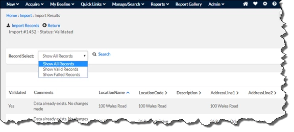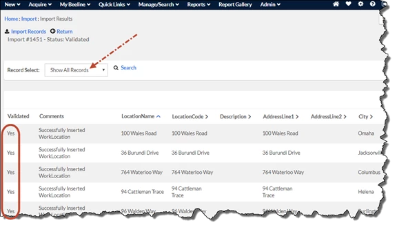 - Use the Record Select pull-down menu to filter which records you want to view. Options include Show All Records, Show Valid Records, or Show Failed Records.