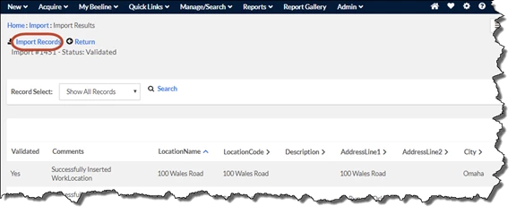 The Beeline Enterprise Import screen is used to track activity and post results once files are processed through the Web Import Tool. A detailed description of the Import Screen layout and functions is available here.