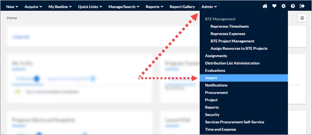 - From your home dashboard, click Admin in the Header Menu bar, then click Import. The Import screen displays.