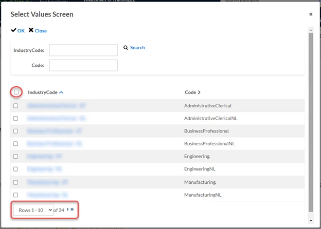 - Click Search to the right of each Required field and then make your selections from the pop-up Select Values Screen as to which categories should be included in your export file. Use the checkboxes to select individual items or the checkbox in the header row to select all items.