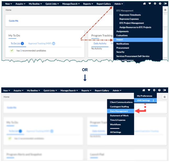 Access to download an import template file is located under the Admin Header Menu or via the Self-Service Data Management selection list located under the Preferences Menu. Both methods are detailed below. System configurations and your user role settings determine which access method is available to you.