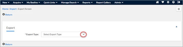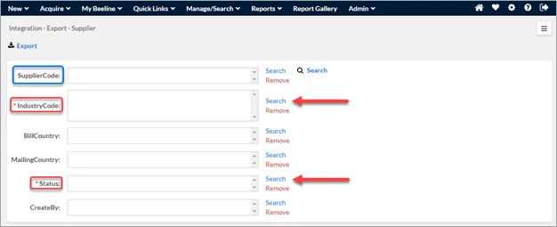 - Expand the Export Type drop-down list and select the export Type to match your intended import. The screen refreshes to display data fields specific to that data template. Notice that Beeline required fields are indicated by an asterisk (*). (The example shown below is based on the Supplier template.)